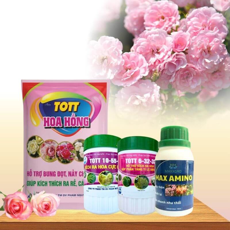 Bộ sản phẩm kích hoa cho hoa hồng gồm 04 món: NPK 10-55-10, NPK 6-32-32, Max amino và phân hữu cơ TOTT hoa hồng.