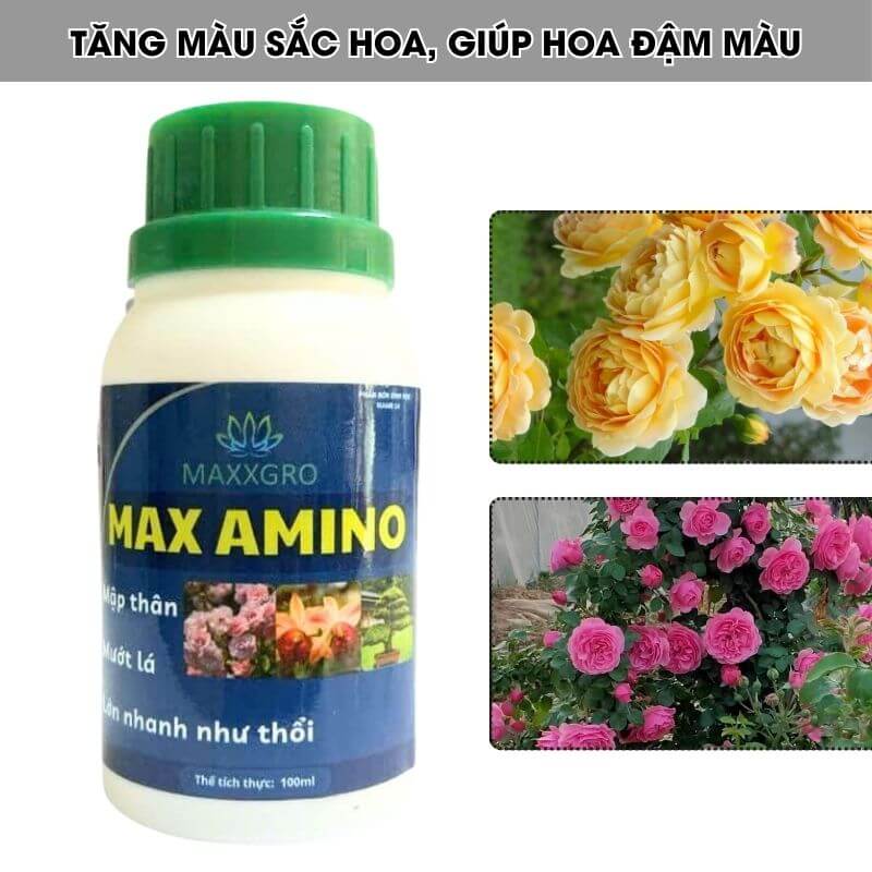 • Bước 4. Pha 2 ml max amino cho 1 lít nước sạch, tưới lên đất trồng cây khi tỉ lệ ra hoa từ 60% trở lên để dưỡng hoa, tăng màu sắc của hoa và chống rụng hoa.