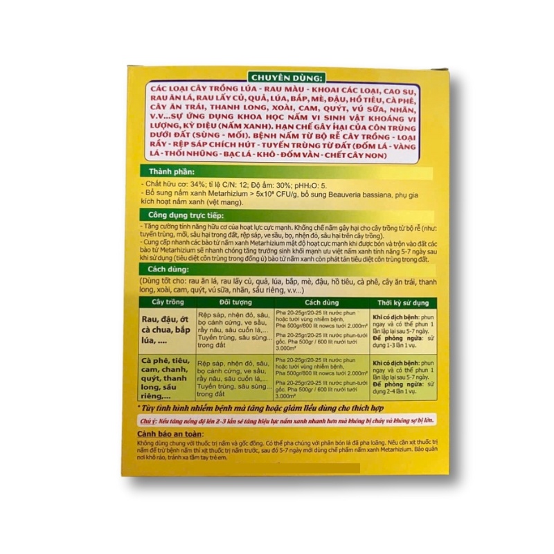 Phòng các loại côn trùng gây hại rễ: Có thể trộn đều với đất, phân bón hữu cơ để bón. Rải đều lên mặt luống trước khi trồng, sử dụng khoảng 3 tháng/lần để tăng mật độ nấm xanh Metarhizium.
