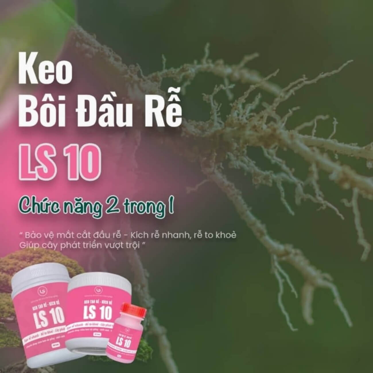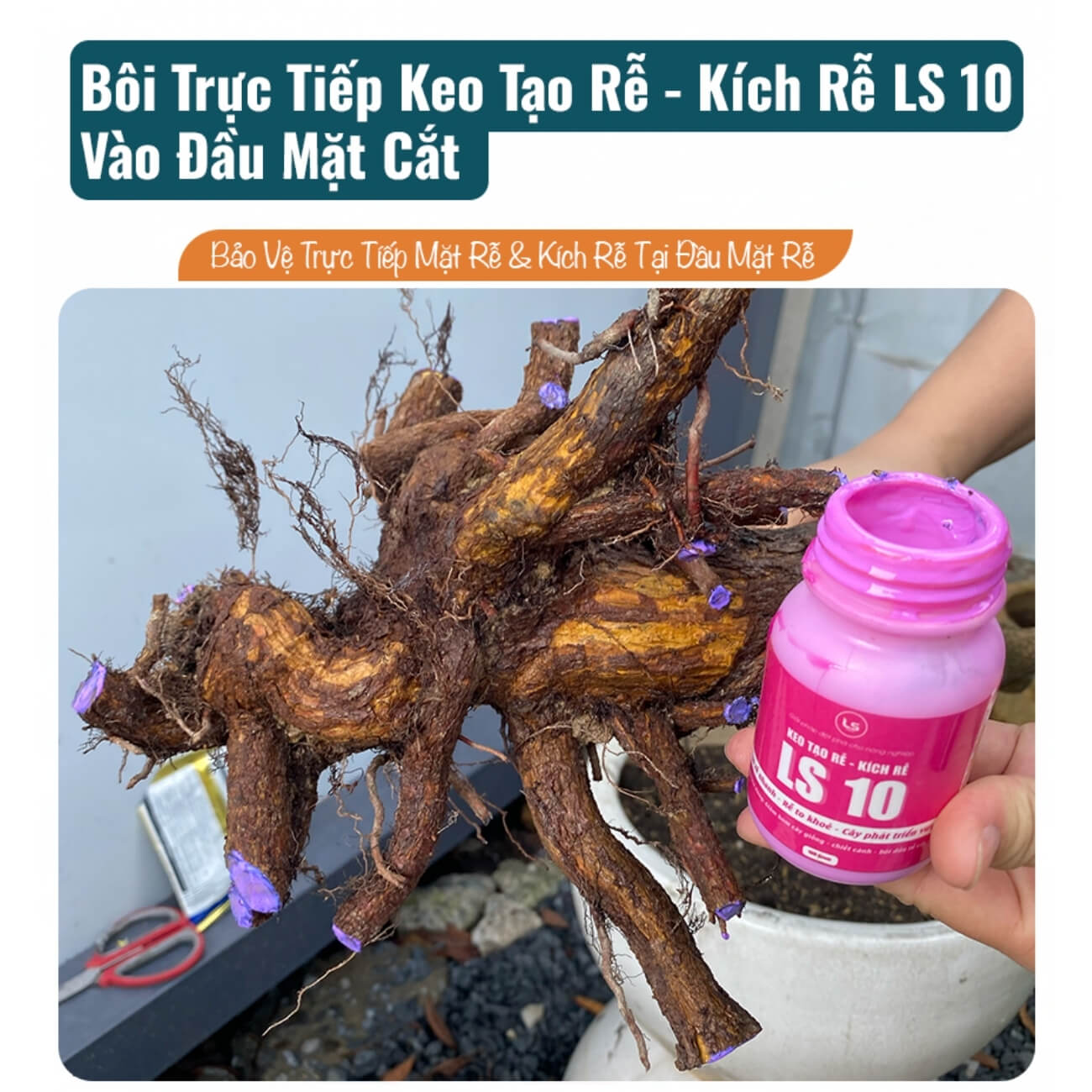 + Keo tạo rễ LS10: Sử dụng cho cây phôi hoặc cây trưởng thành. Sử dụng keo tạo rễ LS10 bôi trực tiếp vào mặt cắt rễ hoặc pha nước tưới để kích ra rễ.