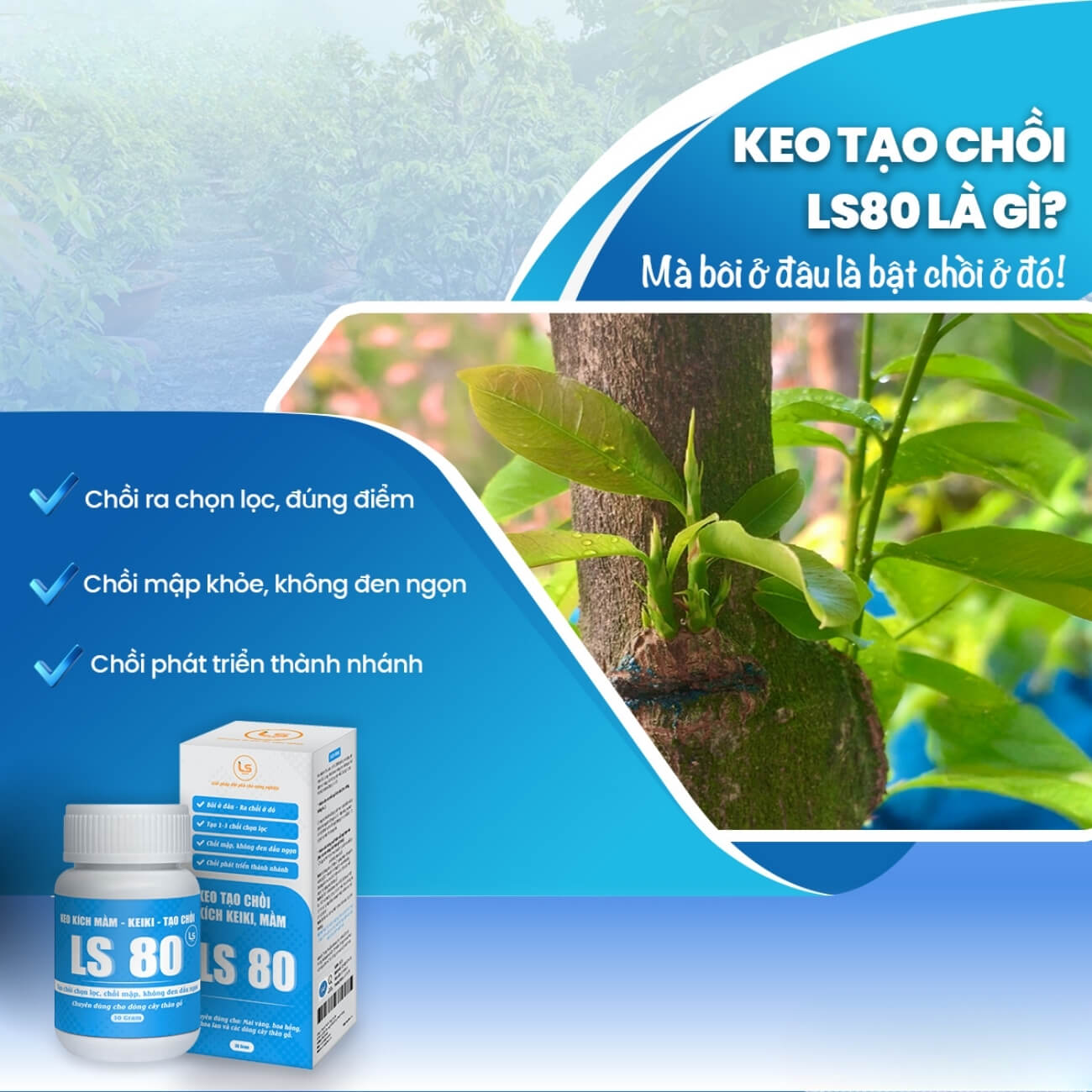 + Keo kích chồi LS80: Dùng dụng cụ cắt sâu vỏ cây tới mạch gỗ với kích cỡ mặt cắt dài 2cm, rộng 0.5cm. Sau đó bôi lớp keo mỏng LS80 vào để kích ra mầm (chồi) ở vị trí bất kỳ. Hoặc có thể dùng bôi lên mắt ngủ để kích mầm chồi ra nhanh.